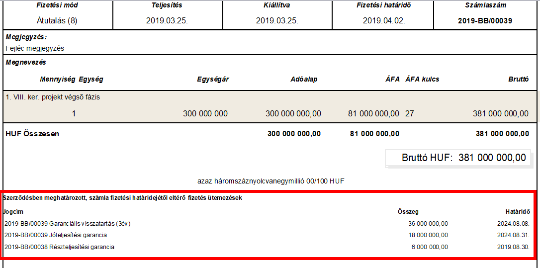 A véglegesített számlán az alkalmazott jogcím(ek) összeggel és határidővel fognak megjelenni.